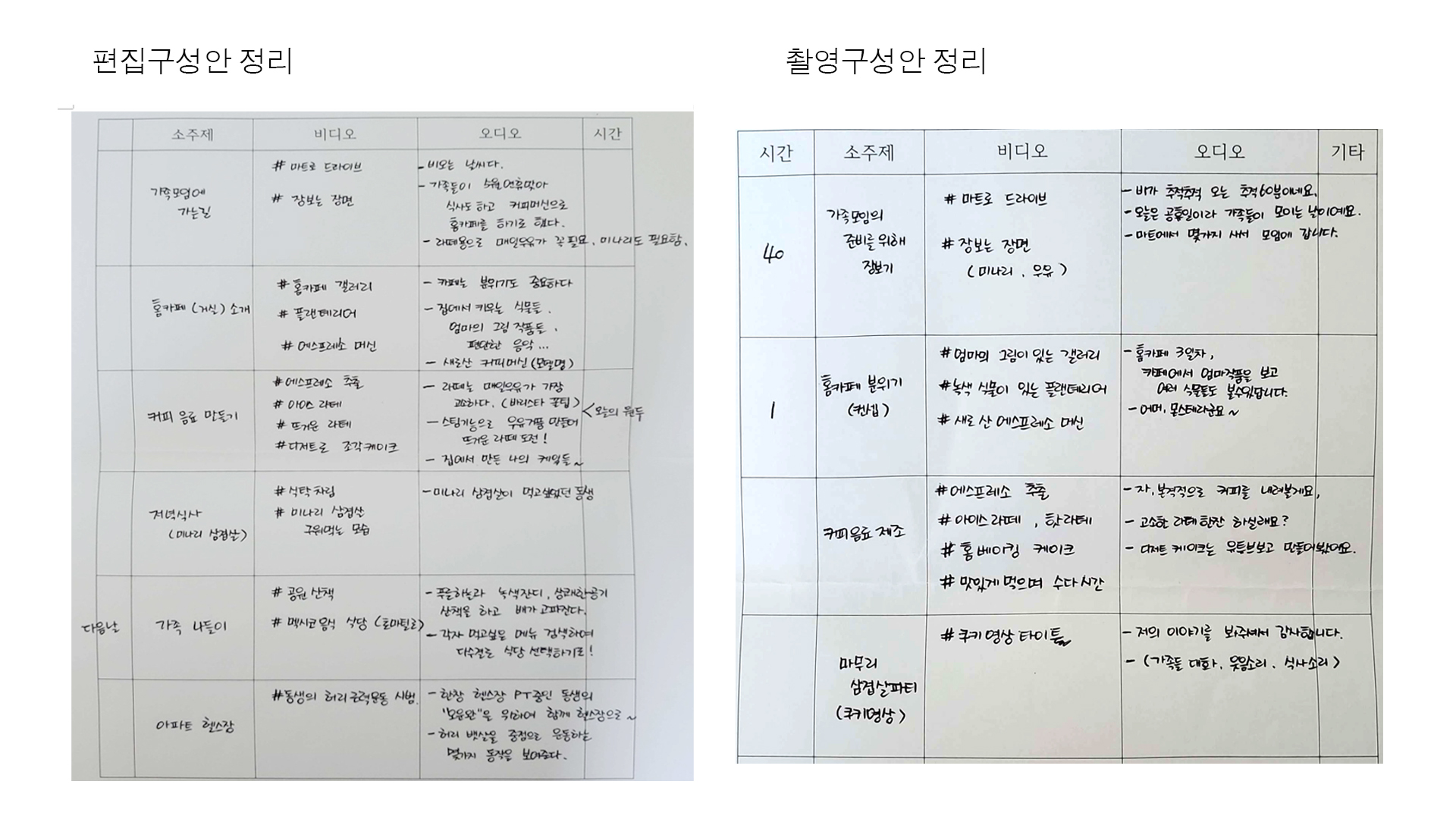 온 가족이 커피를 좋아하고, "가족"이 함께하는 시간이 소중하기에, 영상편집 첫번째로 우리가족의 "홈카페"를 주제로 영상기록을 해보고싶었다. 전국 각 지방에 모두 따로 살고있어서 더욱 소중했던 이번연휴에는 브이로그에 사용할 영상촬영을 이유로 특별히 풍성한 시간이 만들어졌다.
